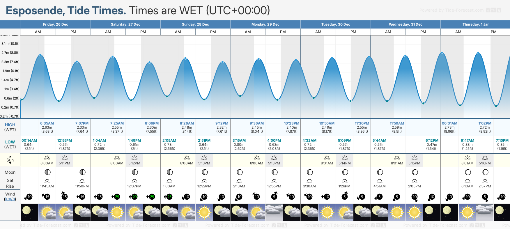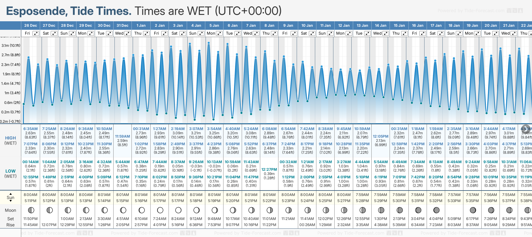December and January Tide charts for Esposende: The tide charts below show the height, time and date of high and low tides for the next 30 days.