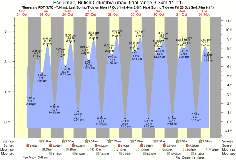 Tide Times are PST (UTC -8.0hrs). Last Spring High Tide at Esquimalt was on Fri 05 Dec (height: 3.12m 10.2ft). Next high Spring Tide at Esquimalt will be on Fri 02 Jan (height: 3.15m 10.3ft).