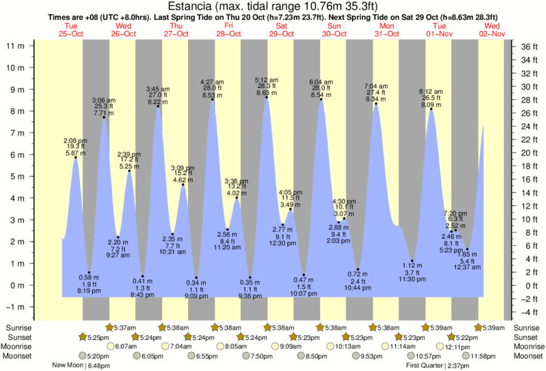 Tide Times are PST (UTC +8.0hrs). Last Spring High Tide at Estancia was on Sun 07 Dec (height: 10.57m 34.7ft). Next high Spring Tide at Estancia will be on Mon 22 Dec (height: 9.74m 32.0ft).