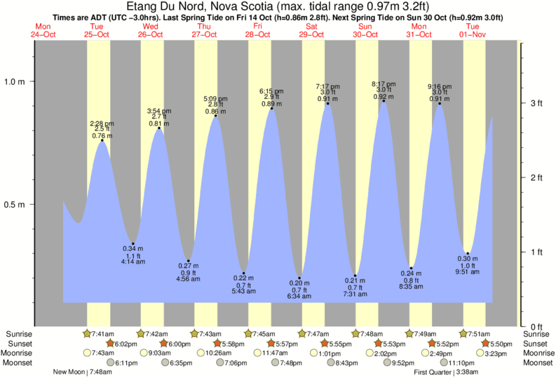 Etang Du Nord tide chart key: The tide chart above shows the height and times of high tide and low tide for Etang Du Nord, Nova Scotia. The grey shading corresponds to nighttime hours between sunset and sunrise at Etang Du Nord.