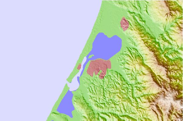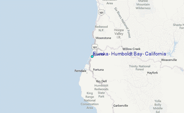 Use this relief map to navigate to tide stations, surf breaks and cities that are in the area of Eureka, Humboldt Bay, California.