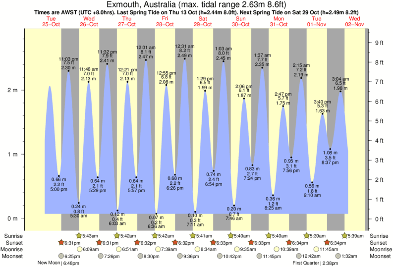 Tide chart for ExmouthShowing low and high tide times for the next 30 days at Exmouth. Tide Times are AWST (UTC +8.0hrs).