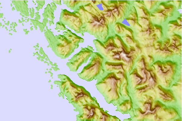 Use this relief map to navigate to tide stations, surf breaks and cities that are in the area of Falcon Arm, Slocum Arm, Alaska.