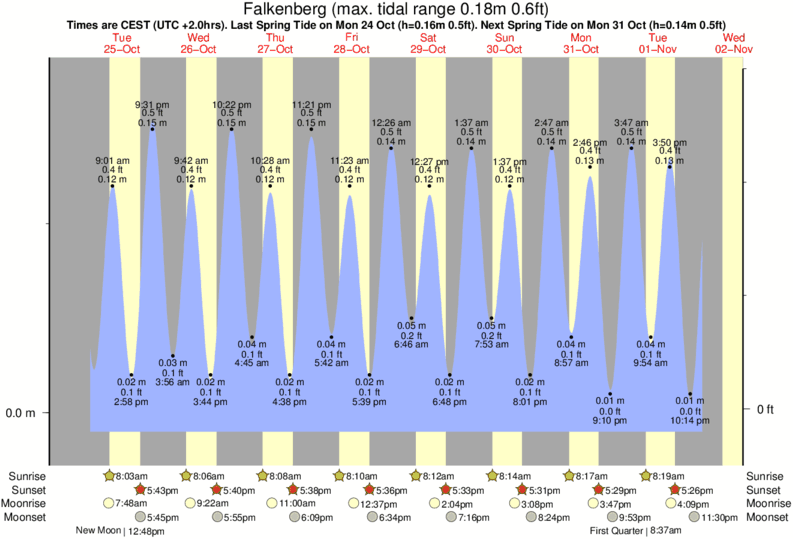 Tide Times are CET (UTC +1.0hrs). Last Spring High Tide at Falkenberg was on Sat 20 Dec (height: 0.17m 0.6ft). Next high Spring Tide at Falkenberg will be on Fri 02 Jan (height: 0.18m 0.6ft).
