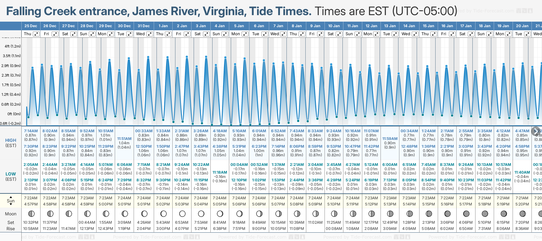 December and January Tide charts for Falling Creek entrance, James River: The tide charts below show the height, time and date of high and low tides for the next 30 days.