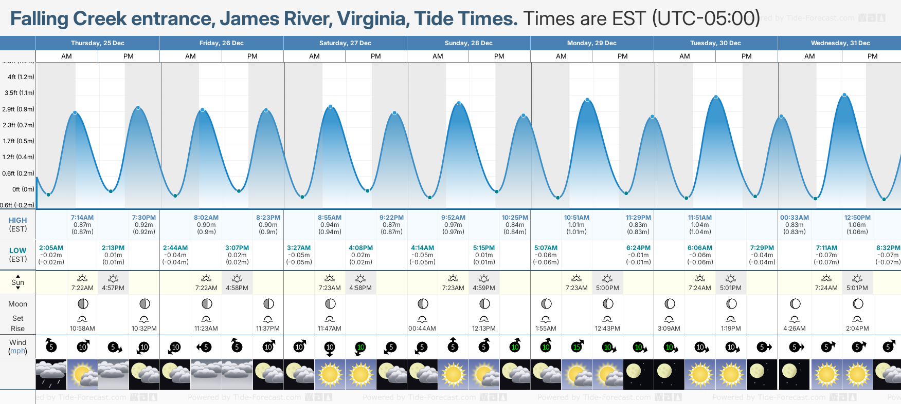 Today's tide times for Falling Creek entrance, James River: Thursday 25 December 2025