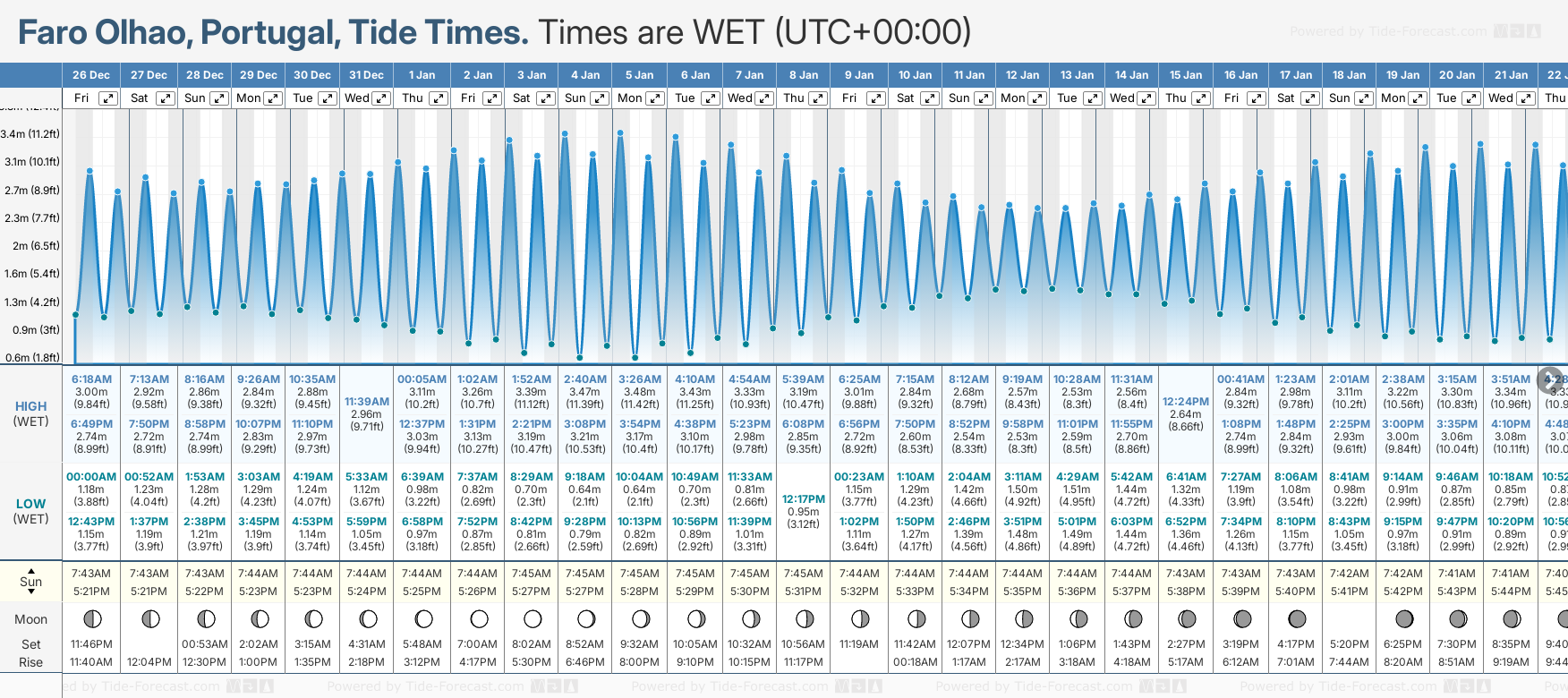 Tide Times are WET (UTC +0hrs). Last Spring High Tide at Faro Olhao was on Mon 22 Dec (height: 3.17m 10.4ft). Next high Spring Tide at Faro Olhao will be on Mon 05 Jan (height: 3.48m 11.4ft).
