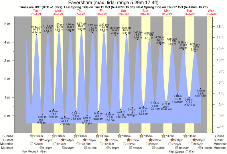 Tide chart for FavershamShowing low and high tide times for the next 30 days at Faversham. Tide Times are GMT (UTC +0hrs).