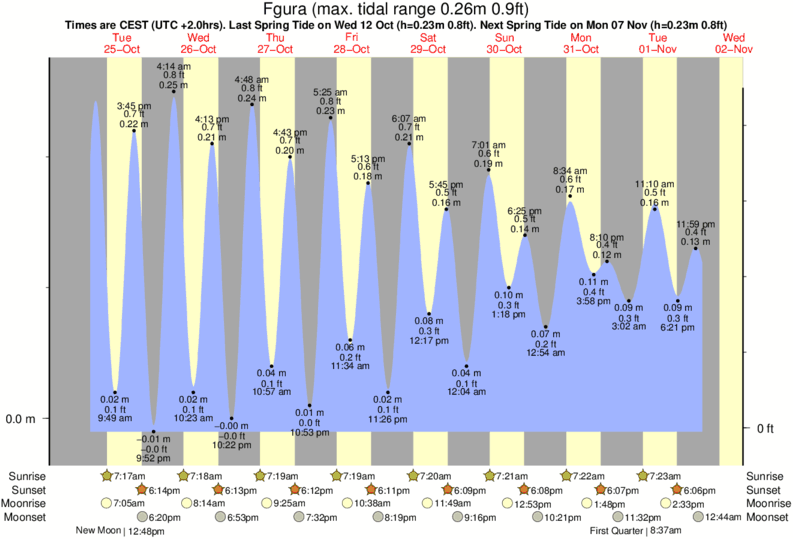 Tide Times are CET (UTC +1.0hrs). Last Spring High Tide at Fgura was on Fri 19 Dec (height: 0.22m 0.7ft). Next high Spring Tide at Fgura will be on Fri 02 Jan (height: 0.24m 0.8ft).