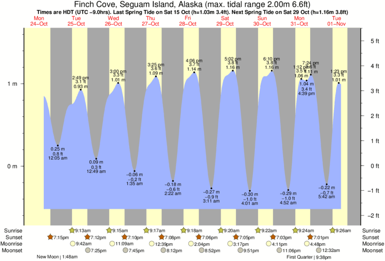Finch Cove, Seguam Island tide chart key: The tide chart above shows the height and times of high tide and low tide for Finch Cove, Seguam Island, Alaska. The grey shading corresponds to nighttime hours between sunset and sunrise at Finch Cove, Seguam Island.