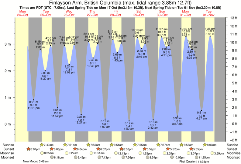 Tide Times are PST (UTC -8.0hrs). Last Spring High Tide at Finlayson Arm was on Sun 07 Dec (height: 3.58m 11.7ft). Next high Spring Tide at Finlayson Arm will be on Thu 25 Dec (height: 3.48m 11.4ft).