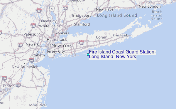 Use this relief map to navigate to tide stations, surf breaks and cities that are in the area of Fire Island Coast Guard Station, Long Island, New York.