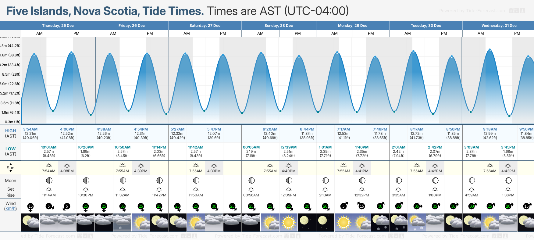 Tide chart for Five IslandsShowing low and high tide times for the next 30 days at Five Islands. Tide Times are AST (UTC -4.0hrs).