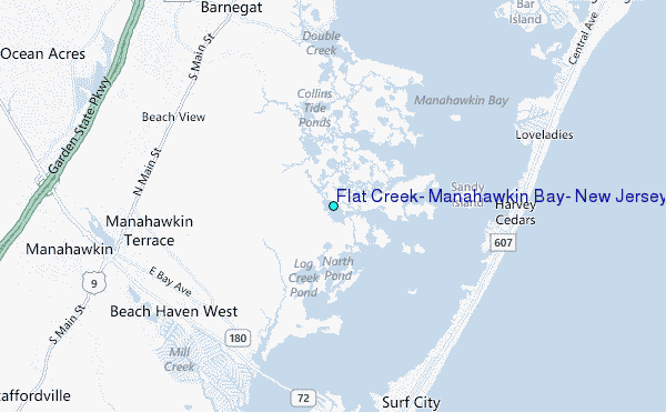 Use this relief map to navigate to tide stations, surf breaks and cities that are in the area of Flat Creek, Manahawkin Bay, New Jersey.