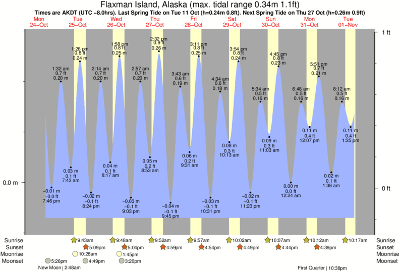 Tide Times are AKST (UTC -9.0hrs). Last Spring High Tide at Flaxman Island was on Thu 18 Dec (height: 0.23m 0.8ft). Next high Spring Tide at Flaxman Island will be on Fri 02 Jan (height: 0.27m 0.9ft).