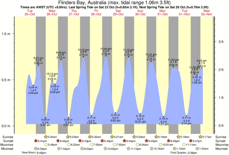 Tide Times are AWST (UTC +8.0hrs). Last Spring High Tide at Flinders Bay was on Sun 07 Dec (height: 0.86m 2.8ft). Next high Spring Tide at Flinders Bay will be on Sun 21 Dec (height: 0.84m 2.8ft).