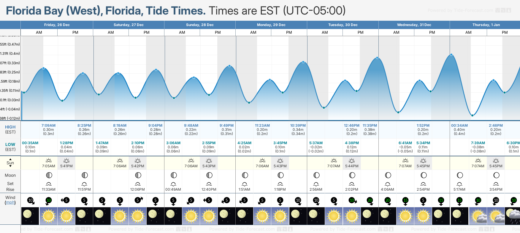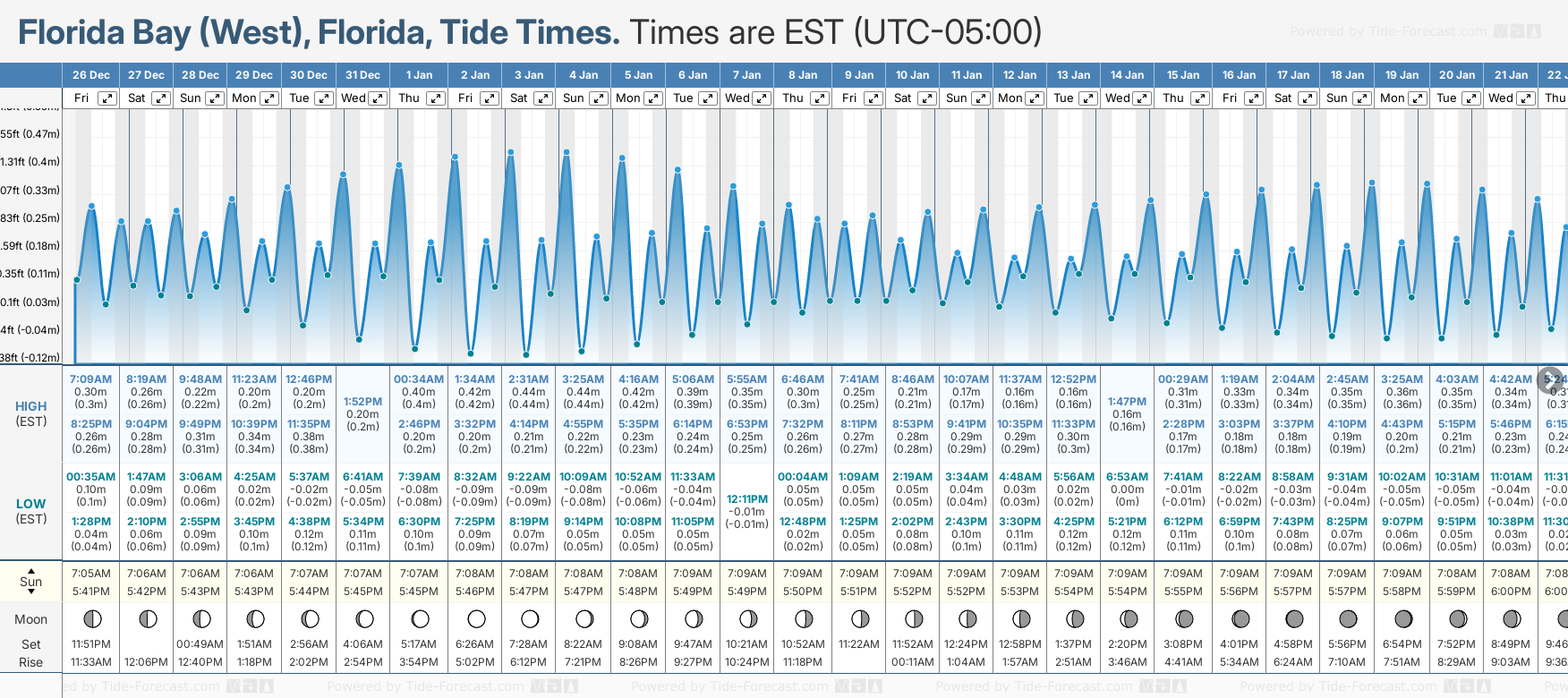 Tide Times are EST (UTC -5.0hrs). Last Spring High Tide at Florida Bay (West) was on Sun 21 Dec (height: 0.38m 1.2ft). Next high Spring Tide at Florida Bay (West) will be on Fri 02 Jan (height: 0.44m 1.4ft).