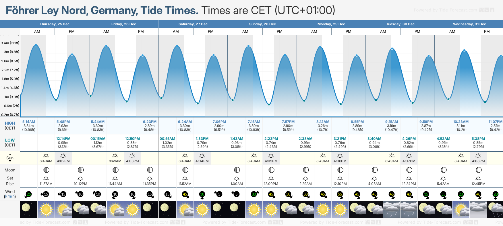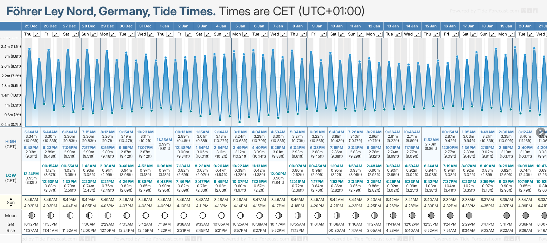 Tide Times are CET (UTC +1.0hrs). Last Spring High Tide at Fohrer Ley Nord was on Tue 23 Dec (height: 3.48m 11.4ft). Next high Spring Tide at Fohrer Ley Nord will be on Sun 28 Dec (height: 3.30m 10.8ft).