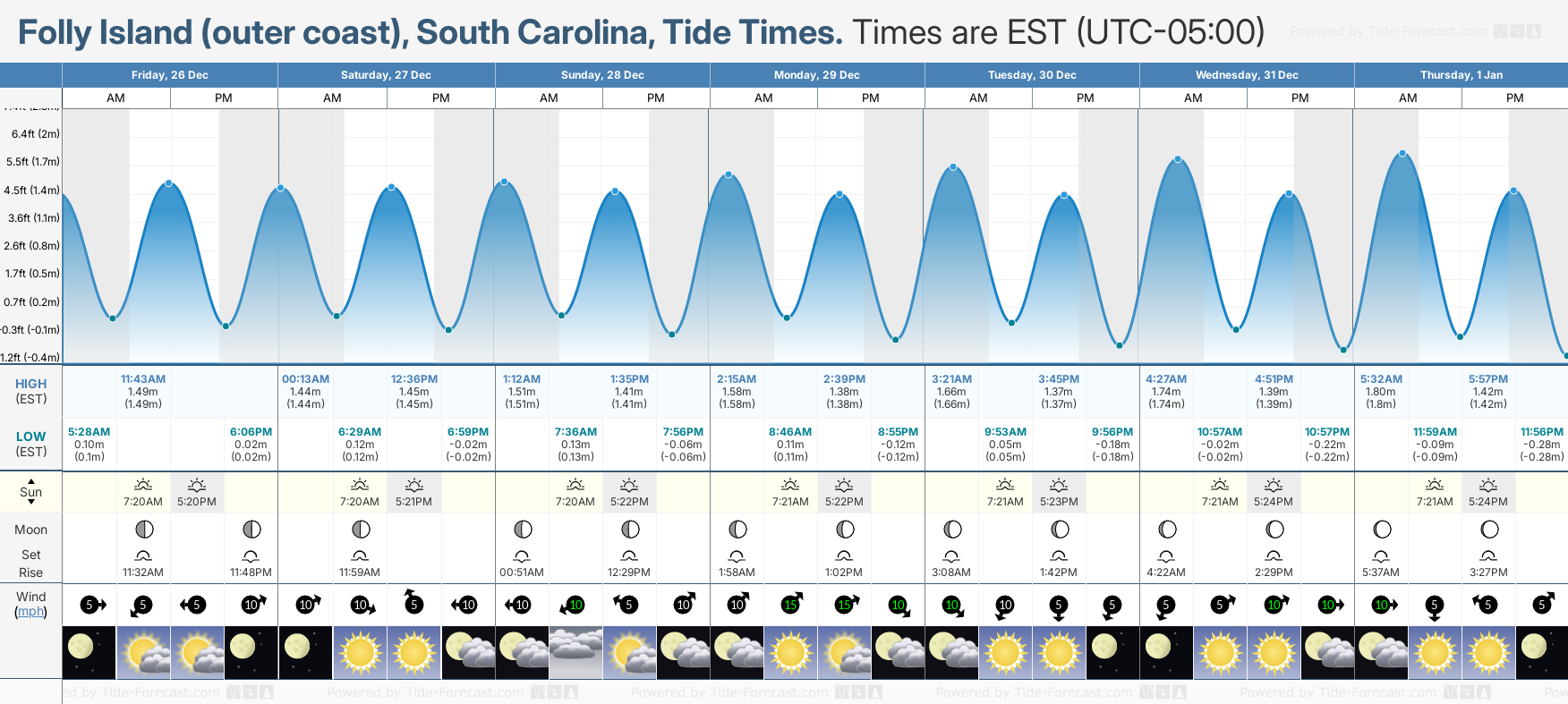 Tide chart for Folly BeachShowing low and high tide times for the next 30 days at Folly Beach. Tide Times are EST (UTC -5.0hrs).