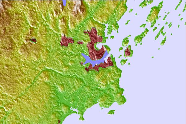 Use this relief map to navigate to tide stations, surf breaks and cities that are in the area of Fore River, Maine.