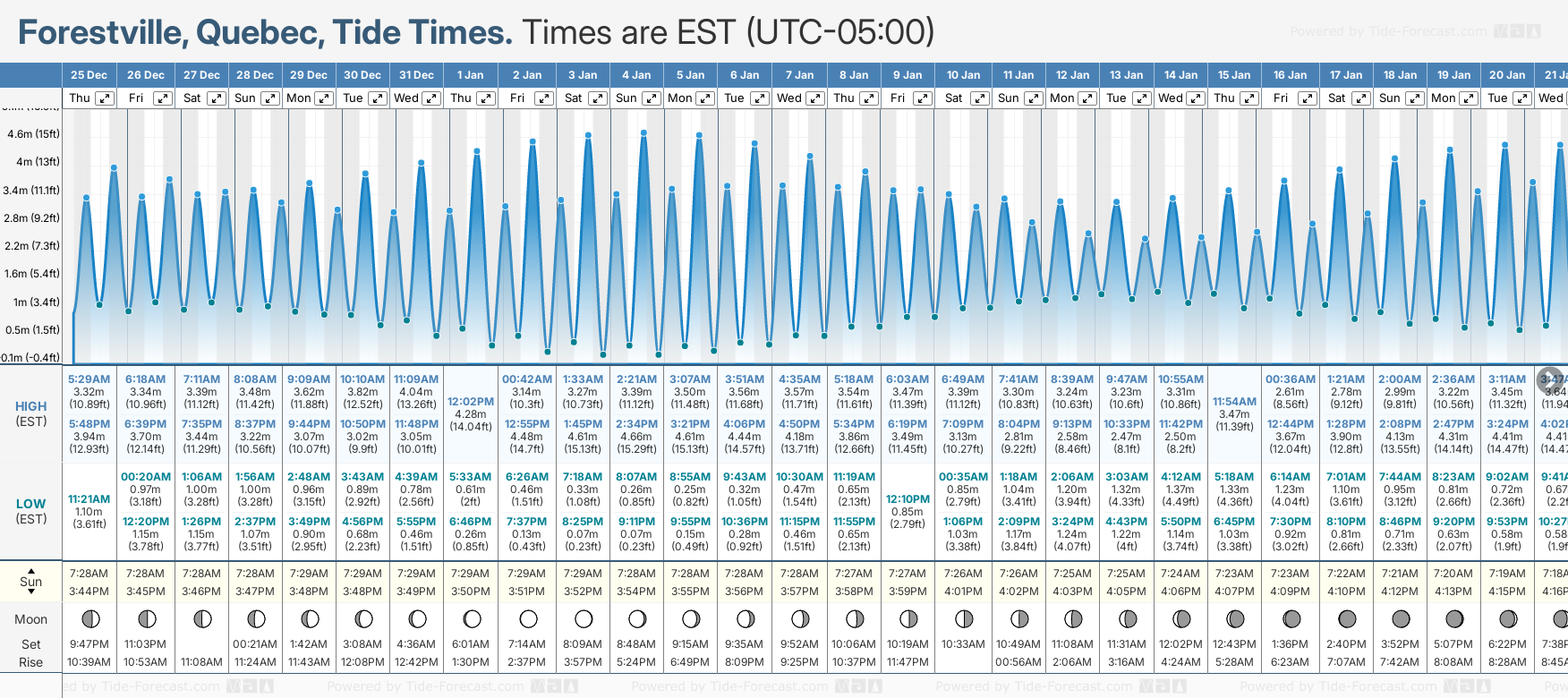 Tide Times are EST (UTC -5.0hrs). Last Spring High Tide at Forestville was on Mon 22 Dec (height: 4.27m 14.0ft). Next high Spring Tide at Forestville will be on Sun 04 Jan (height: 4.66m 15.3ft).