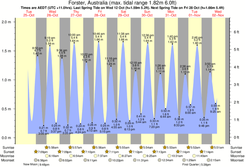 Tide Times are AEDT (UTC +11.0hrs). Last Spring High Tide at Forster was on Sat 06 Dec (height: 1.85m 6.1ft). Next high Spring Tide at Forster will be on Sun 21 Dec (height: 1.67m 5.5ft).