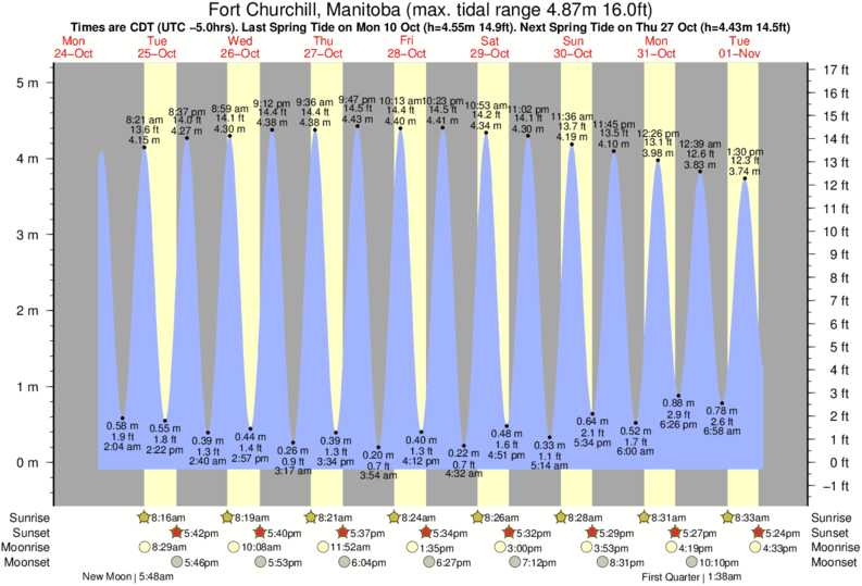 Fort Churchill tide chart key: The tide chart above shows the height and times of high tide and low tide for Fort Churchill, Manitoba. The grey shading corresponds to nighttime hours between sunset and sunrise at Fort Churchill.