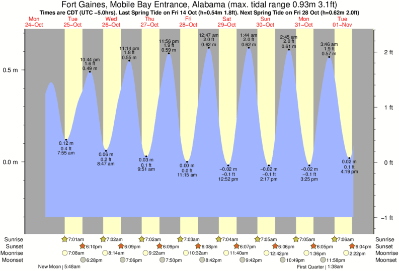Tide chart for Fort Gaines, Mobile Bay EntranceShowing low and high tide times for the next 30 days at Fort Gaines, Mobile Bay Entrance. Tide Times are CST (UTC -6.0hrs).