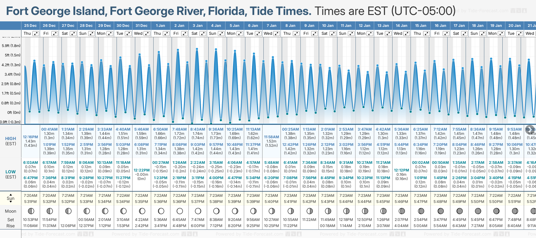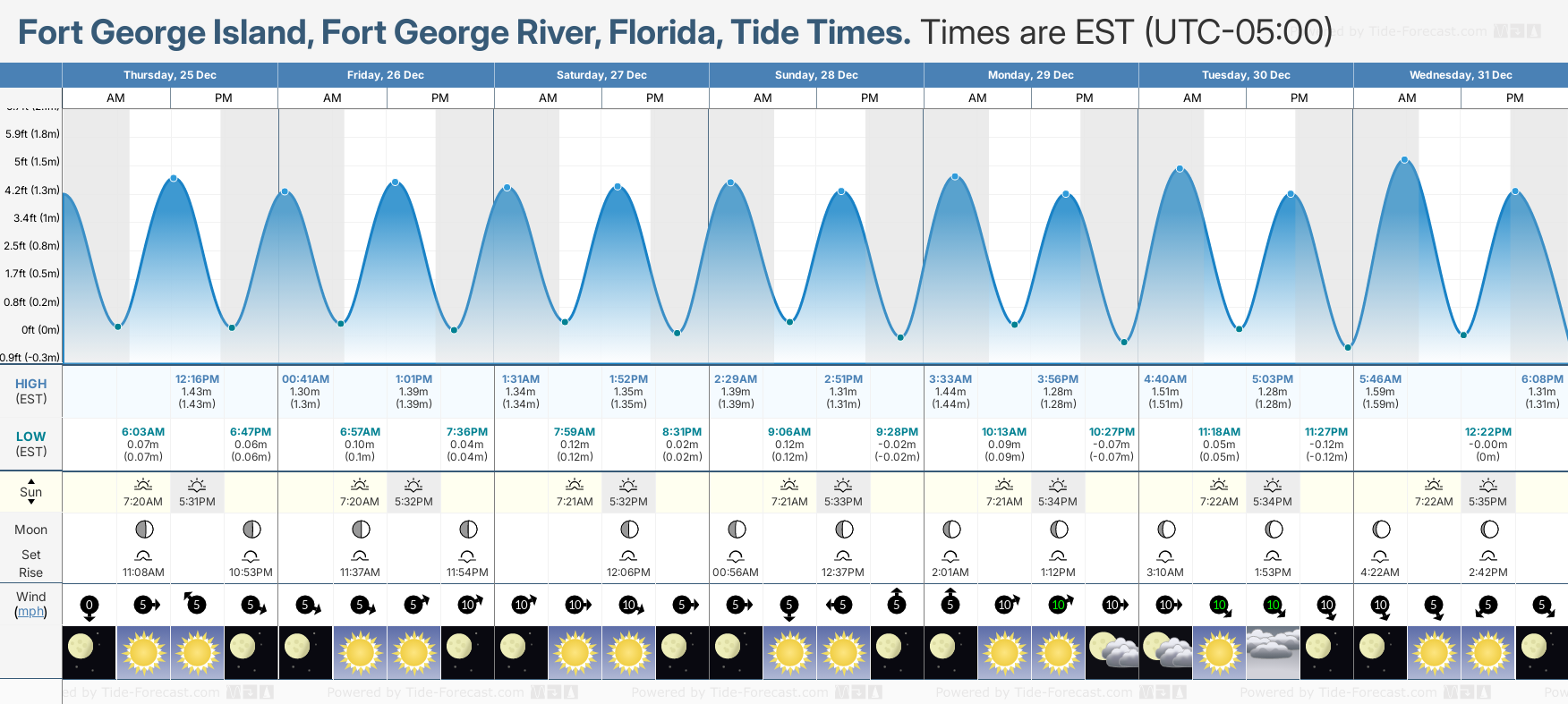 December and January Tide charts for Fort George Island, Fort George River: The tide charts below show the height, time and date of high and low tides for the next 30 days.