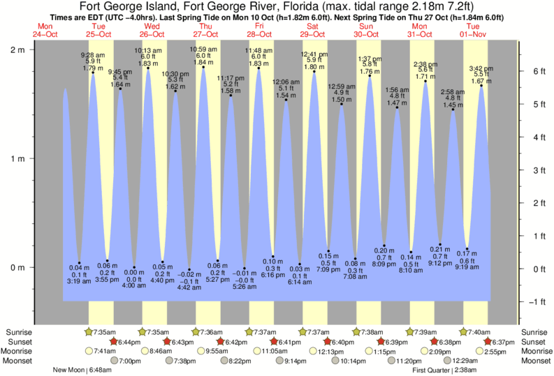 Fort George Island, Fort George River tide chart key: The tide chart above shows the height and times of high tide and low tide for Fort George Island, Fort George River, Florida. The grey shading corresponds to nighttime hours between sunset and sunrise at Fort George Island, Fort George River.