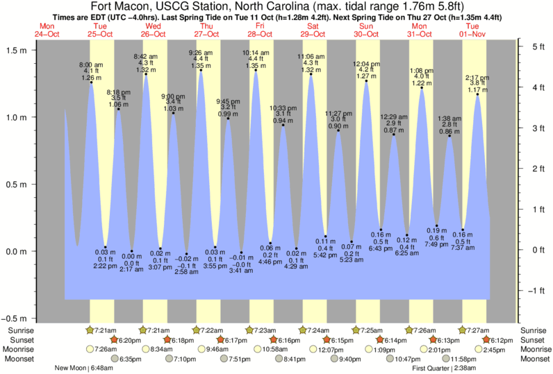 Fort Macon, USCG Station tide chart key: The tide chart above shows the height and times of high tide and low tide for Fort Macon, USCG Station, North Carolina. The grey shading corresponds to nighttime hours between sunset and sunrise at Fort Macon, USCG Station.