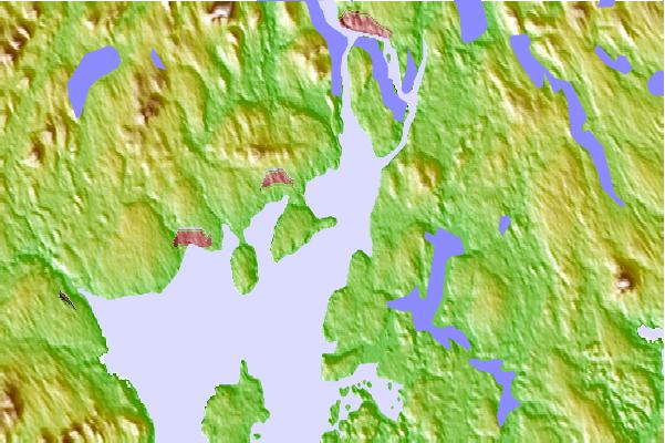 Use this relief map to navigate to tide stations, surf breaks and cities that are in the area of Fort Point, Penobscot River, Maine.