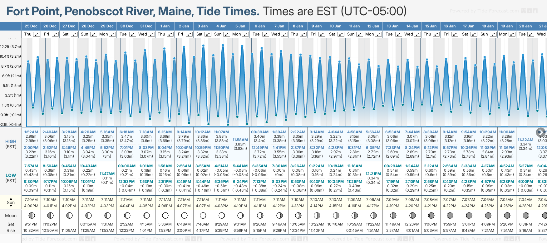 December and January Tide charts for Fort Point, Penobscot River: The tide charts below show the height, time and date of high and low tides for the next 30 days.