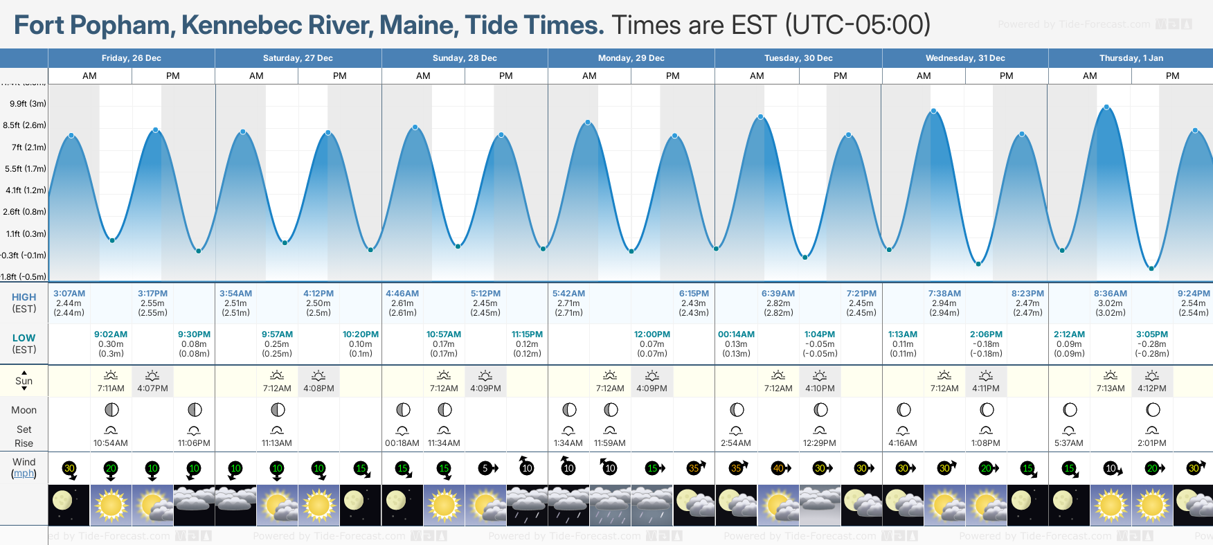 December and January Tide charts for Fort Popham, Kennebec River: The tide charts below show the height, time and date of high and low tides for the next 30 days.