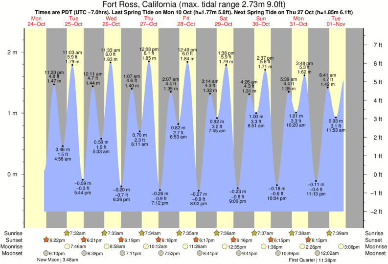 Tide Times are PST (UTC -8.0hrs). Last Spring High Tide at Fort Ross was on Thu 18 Dec (height: 1.79m 5.9ft). Next high Spring Tide at Fort Ross will be on Fri 02 Jan (height: 2.10m 6.9ft).