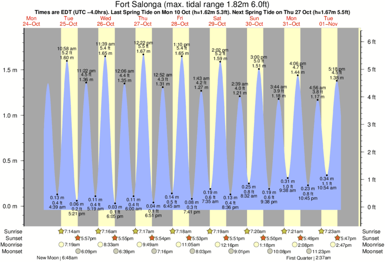Tide chart for Fort SalongaShowing low and high tide times for the next 30 days at Fort Salonga. Tide Times are EST (UTC -5.0hrs).