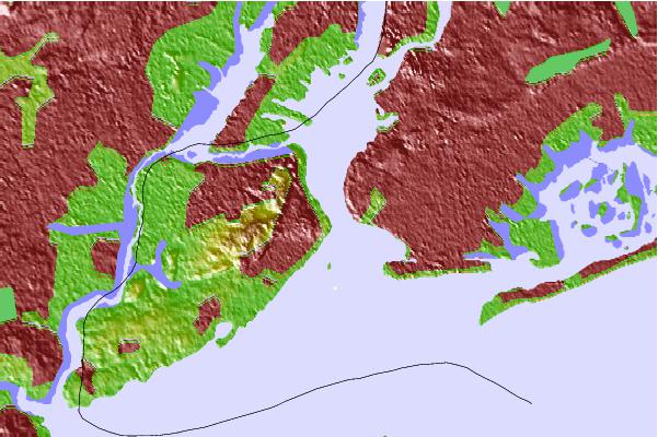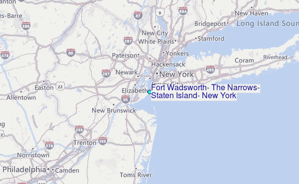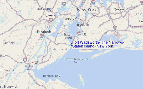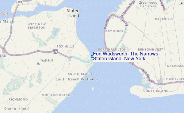Use this relief map to navigate to tide stations, surf breaks and cities that are in the area of Fort Wadsworth, The Narrows, Staten Island, New York.