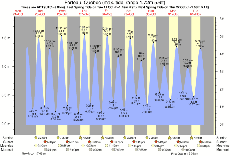 Tide Times are AST (UTC -4.0hrs). Last Spring High Tide at Forteau was on Sat 06 Dec (height: 1.63m 5.3ft). Next high Spring Tide at Forteau will be on Sun 21 Dec (height: 1.44m 4.7ft).