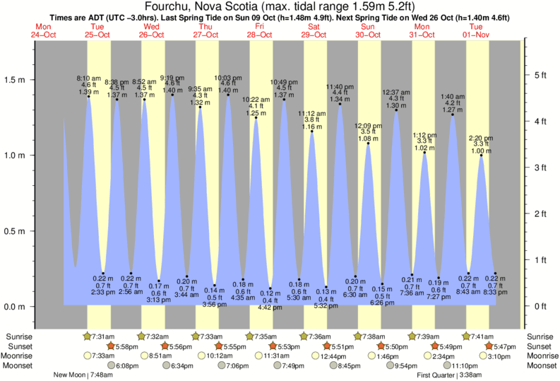 Fourchu tide chart key: The tide chart above shows the height and times of high tide and low tide for Fourchu, Nova Scotia. The grey shading corresponds to nighttime hours between sunset and sunrise at Fourchu.