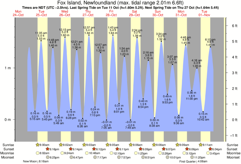 Fox Island tide chart key: The tide chart above shows the height and times of high tide and low tide for Fox Island, Newfoundland. The grey shading corresponds to nighttime hours between sunset and sunrise at Fox Island.