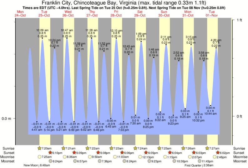 Tide Times are EST (UTC -5.0hrs). Last Spring High Tide at Franklin City, Chincoteague Bay was on Fri 19 Dec (height: 0.22m 0.7ft). Next high Spring Tide at Franklin City, Chincoteague Bay will be on Fri 02 Jan (height: 0.25m 0.8ft).