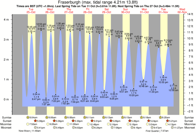 December and January Tide charts for Fraserburgh: The tide charts below show the height, time and date of high and low tides for the next 30 days.