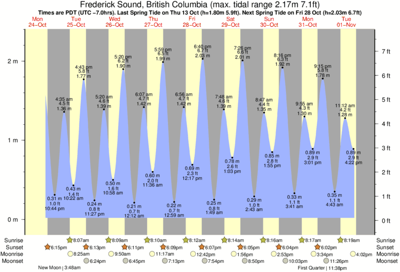 Frederick Sound tide chart key: The tide chart above shows the height and times of high tide and low tide for Frederick Sound, British Columbia. The grey shading corresponds to nighttime hours between sunset and sunrise at Frederick Sound.