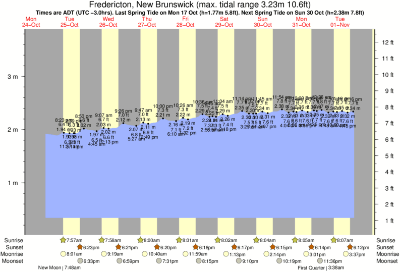 Tide Times are AST (UTC -4.0hrs). Last Spring High Tide at Fredericton was on Sun 07 Dec (height: 2.18m 7.2ft). Next high Spring Tide at Fredericton will be on Thu 25 Dec (height: 1.77m 5.8ft).