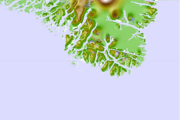 Use this relief map to navigate to tide stations, surf breaks and cities that are in the area of Frederiksdal, Greenland.