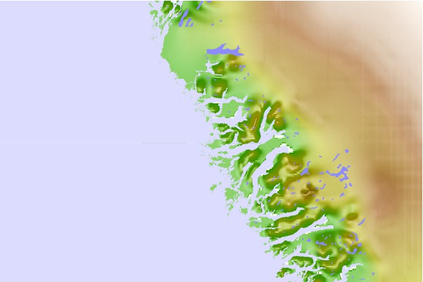 Use this relief map to navigate to tide stations, surf breaks and cities that are in the area of Frederikshåb, Greenland.
