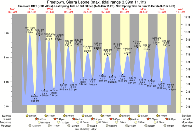 December and January Tide charts for Freetown, Sierra Leone: The tide charts below show the height, time and date of high and low tides for the next 30 days.
