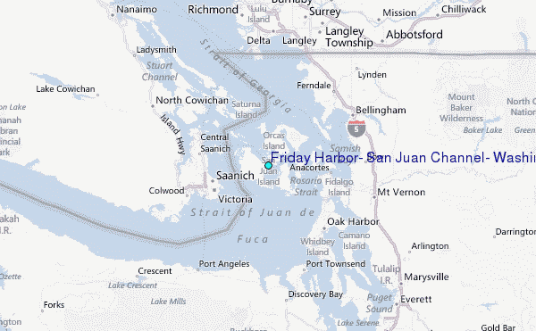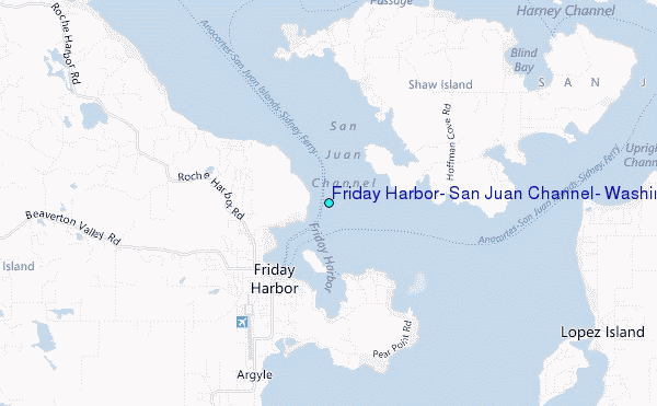 Use this relief map to navigate to tide stations, surf breaks and cities that are in the area of Friday Harbor, San Juan Channel, Washington.
