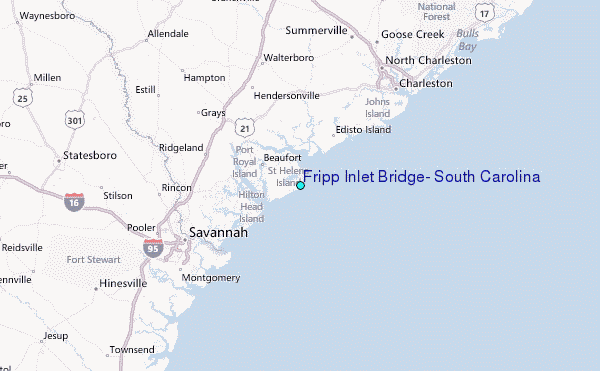 Use this relief map to navigate to tide stations, surf breaks and cities that are in the area of Fripp Inlet Bridge, South Carolina.