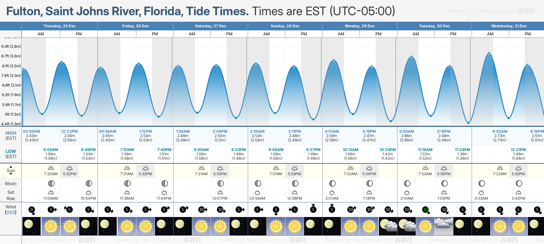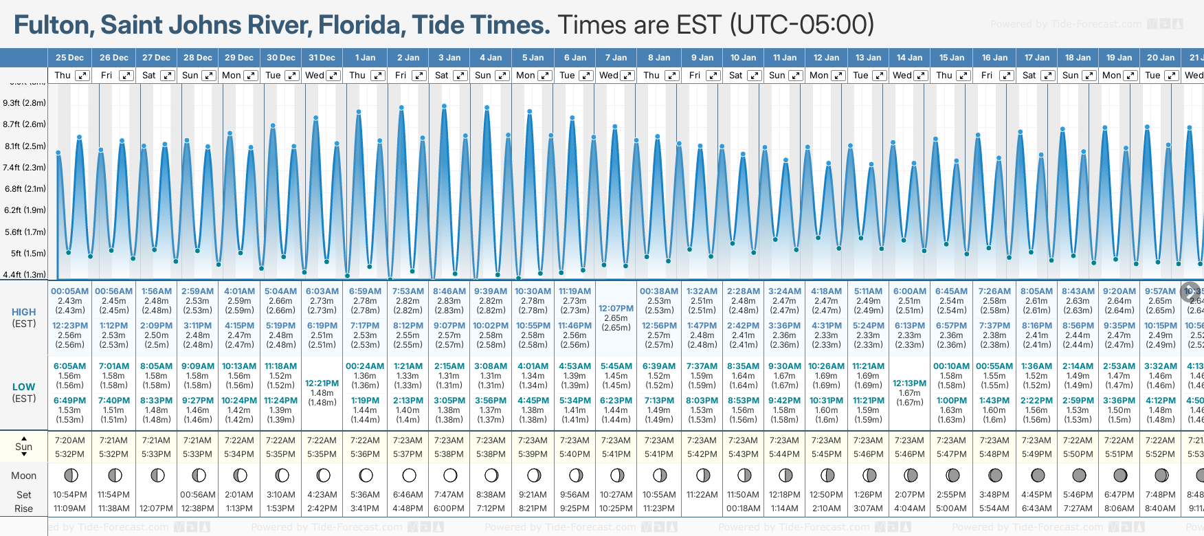 December and January Tide charts for Fulton, Saint Johns River: The tide charts below show the height, time and date of high and low tides for the next 30 days.